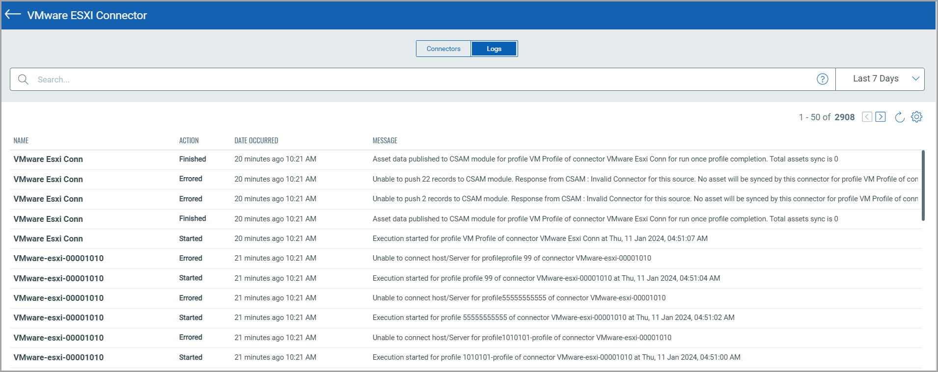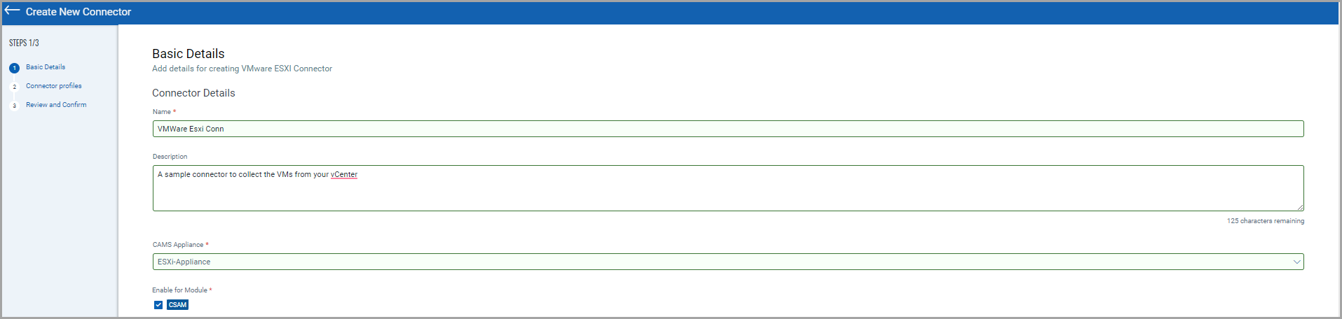 Your connector is created successfully and has Asset Identification rules provided. Now, it should start fetching from VMware ESXi. To view the Asset information, you must navigate to the CSAM application.