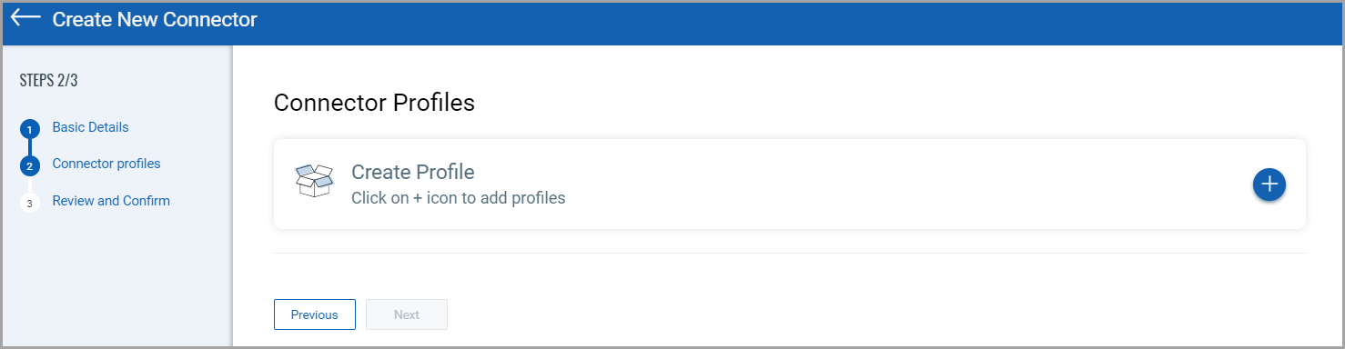 1. In the Connector Profile screen, click on the + icon to provide the required details: