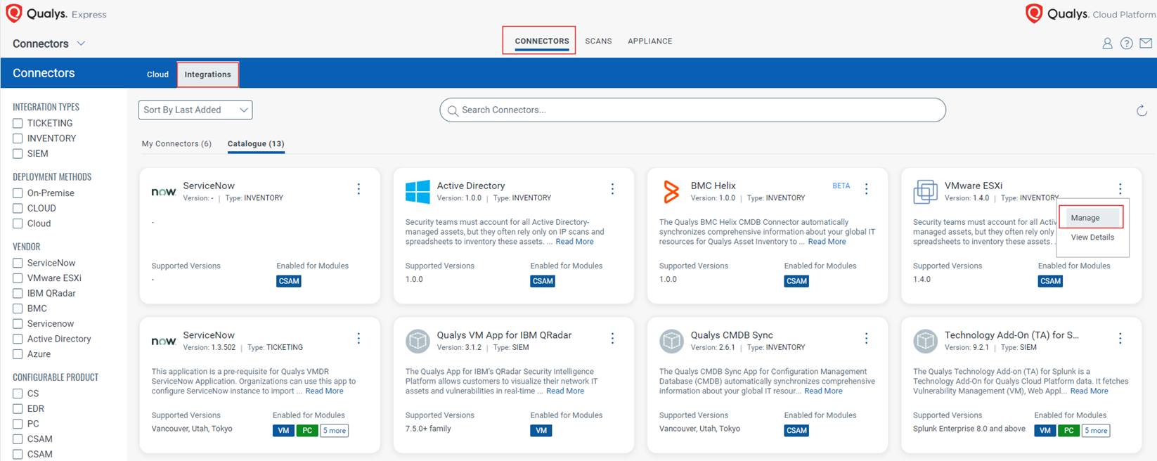 The Qualys VMware ESXi Connector synchronizes comprehensive information about your vCenter VMs and ESXi hosts to Qualys Asset Inventory, i.e., to CSAM. This connector will be deployed on the appliance in a customer environment. The VMware ESXi Connector leverages Qualys' highly distributed and scalable cloud platform to continually maintain a complete inventory of your vCenter assets. The connector offers one-way synchronization from VMware to Qualys, allowing you to discover your VMs and ESXi hosts in the CSAM module. Supported VMware versions are 5.0 to 8.0.