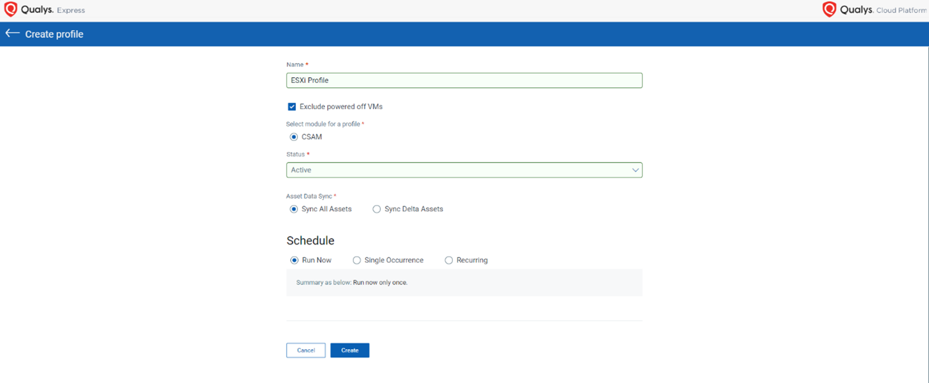 - Sync All Assets - When this option is configured in the profile, the connector with this profile will sync all candidate VMs and ESXi hosts data from vCenter to Qualys on each occurrence/execution of the connector.