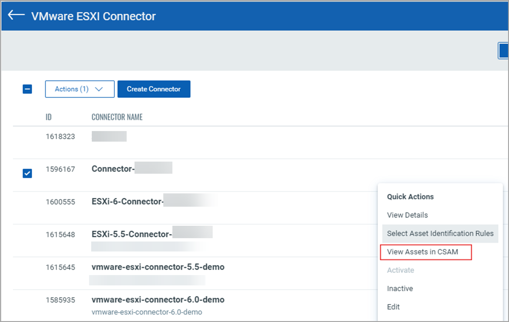 Select any of your connectors, click Actions, and click View Assets in CSAM.