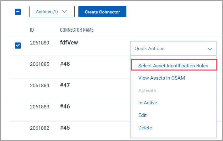 Once you have created a connector, you must specify the Asset Identification rules to determine which attributes must be fetched and in which order. Select a connector and click Actions.