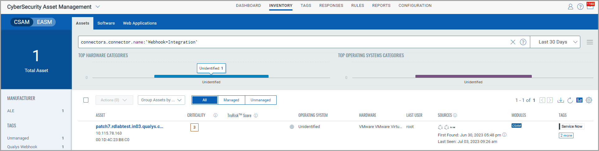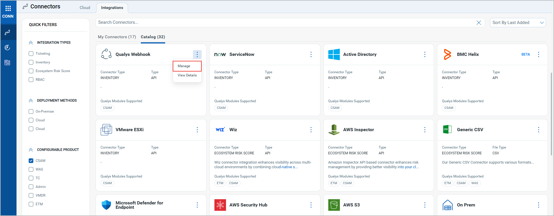 A Qualys Webhook connector lets you connect and discover resources of third-party inventories. The discovered assets can be viewed in the CSAM application. The CSAM APIs are required to establish a connection with the third-party service. Once you have created the Connector using the steps listed below, refer to the Qualys CSAM API guide on establishing a connection using the Qualys CSAM APIs.