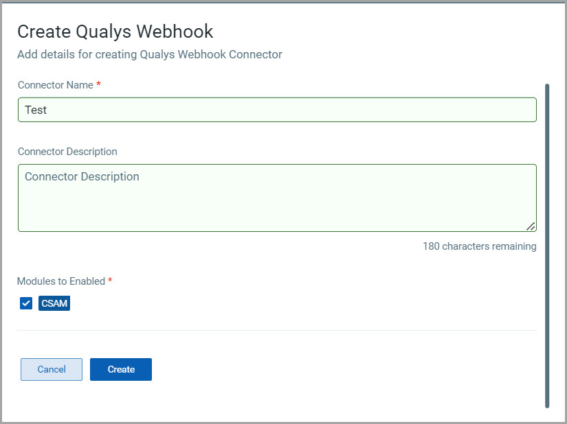 Modules to Enable - Select the Qualys service the connector will have access to. Select CSAM to pass the Connector information to the CSAM application.