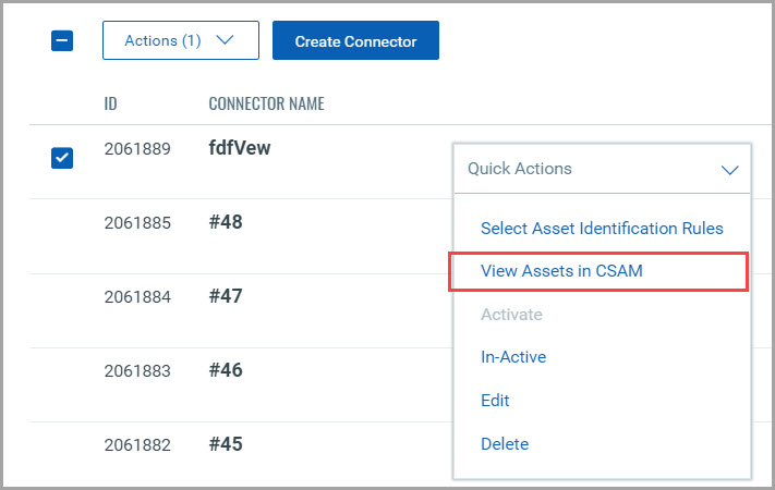 Select any of your connectors, click Actions, and click View Assets in CSAM.
