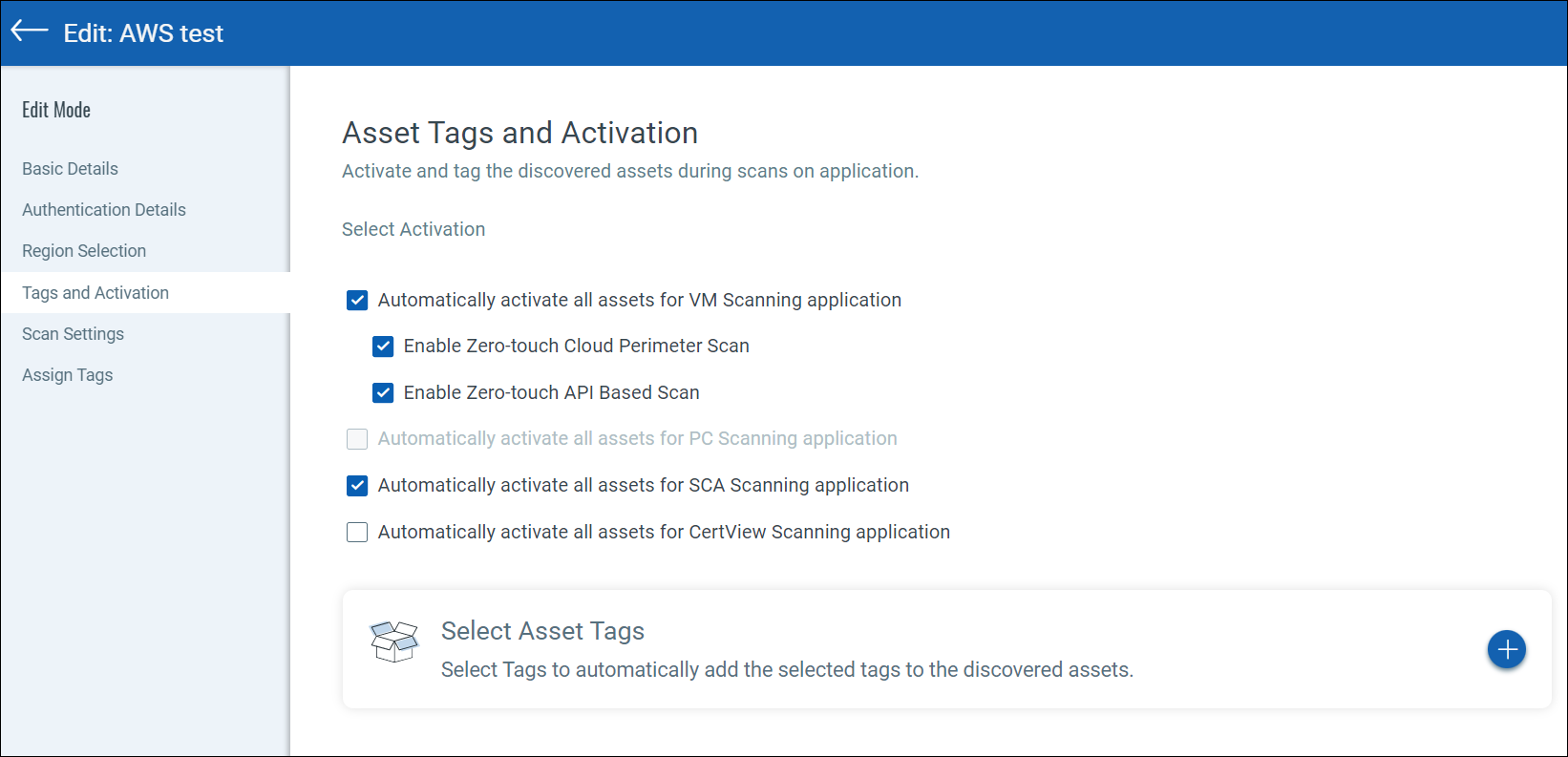 We can activate AWS assets for scanning automatically so you do not have to take this extra step. Select the required check box to enable activation for the required app. We automatically activate the assets as they are discovered and even assign them tags if you want. Enable Vulnerability Management (VM) Scanning to scan discovered assets for vulnerabilities.