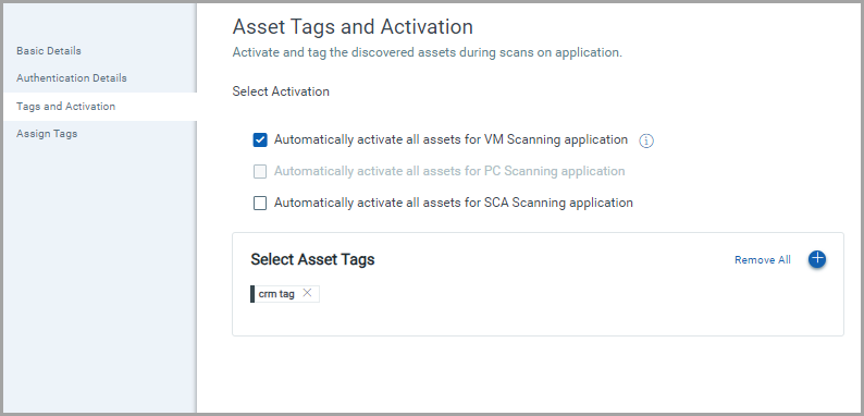 We can activate assets for scanning automatically, so you don't have to take this extra step. Select the required check box to enable activation for the required app. We automatically activate the resources as they are discovered and even assign them tags if you want. Enable Vulnerability Management (VM) Scanning to scan discovered assets for vulnerabilities.
