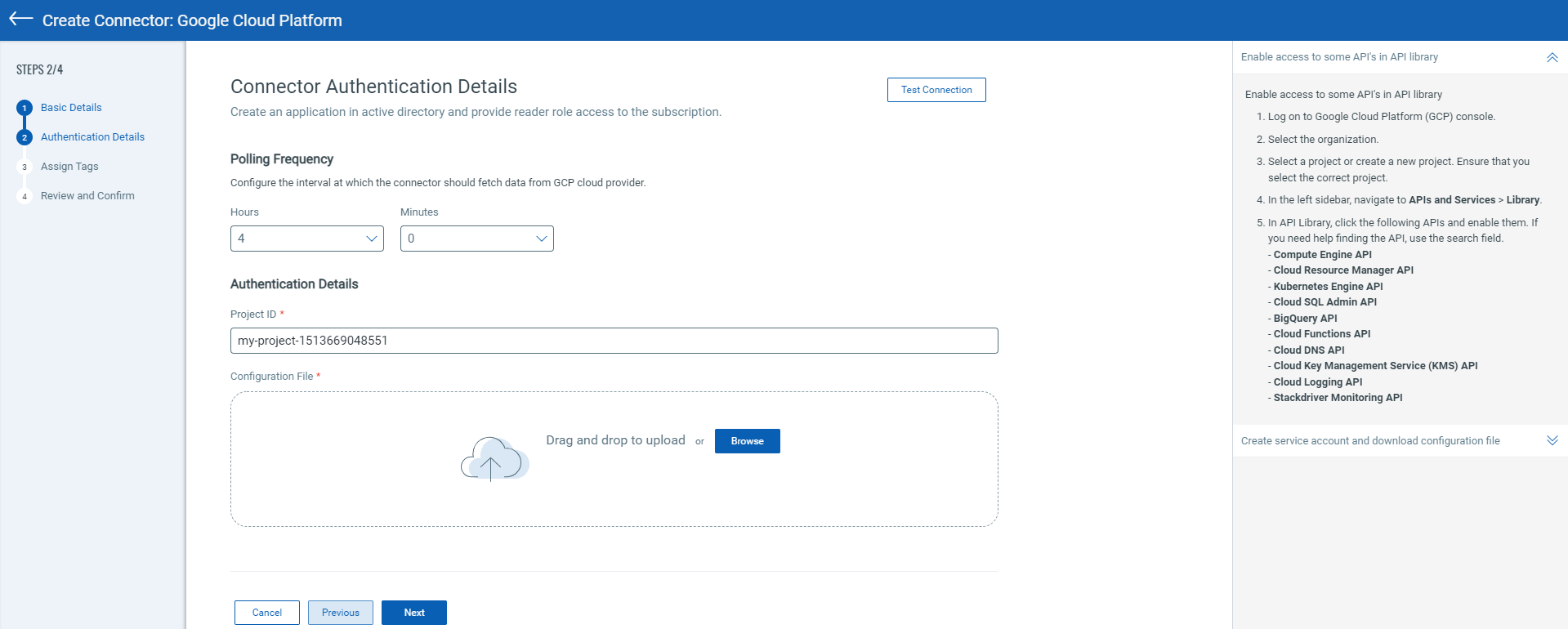 Click Test Connection to verify if the connector can authenticate using the provided service account credentials in the GCP cloud environment. If the test connection is successful, proceed with the connector creation process. If the test connection fails, you may need to check and update the authentication details (configuration file) you uploaded for the connection to work.
