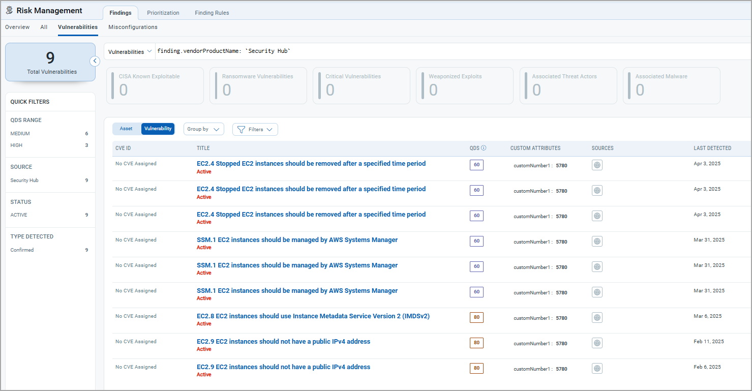 The AWS Security Hub connector consolidates vulnerability findings across AWS services and partner integrations. This comprehensive integration imports host-level vulnerabilities from EC2 instances, container environments, and other AWS resources. The connector enables unified visibility of host-based security findings discovered through AWS's security services ecosystem. Qualys ETM then processes this data by: