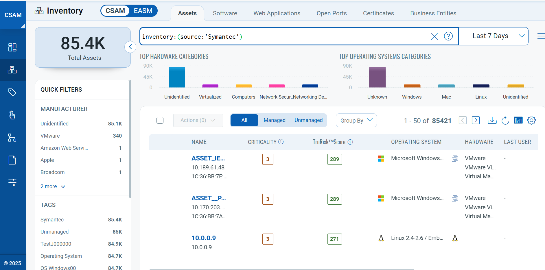 inventory: (source: 'Symantec')to view assets imported from Symantec.