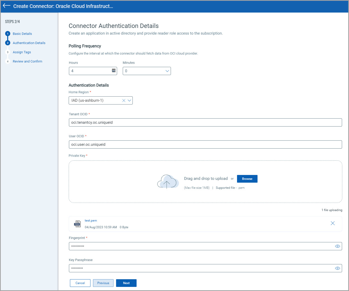 2. Upload the PEM file to the connector creation wizard and provide the fingerprint below.