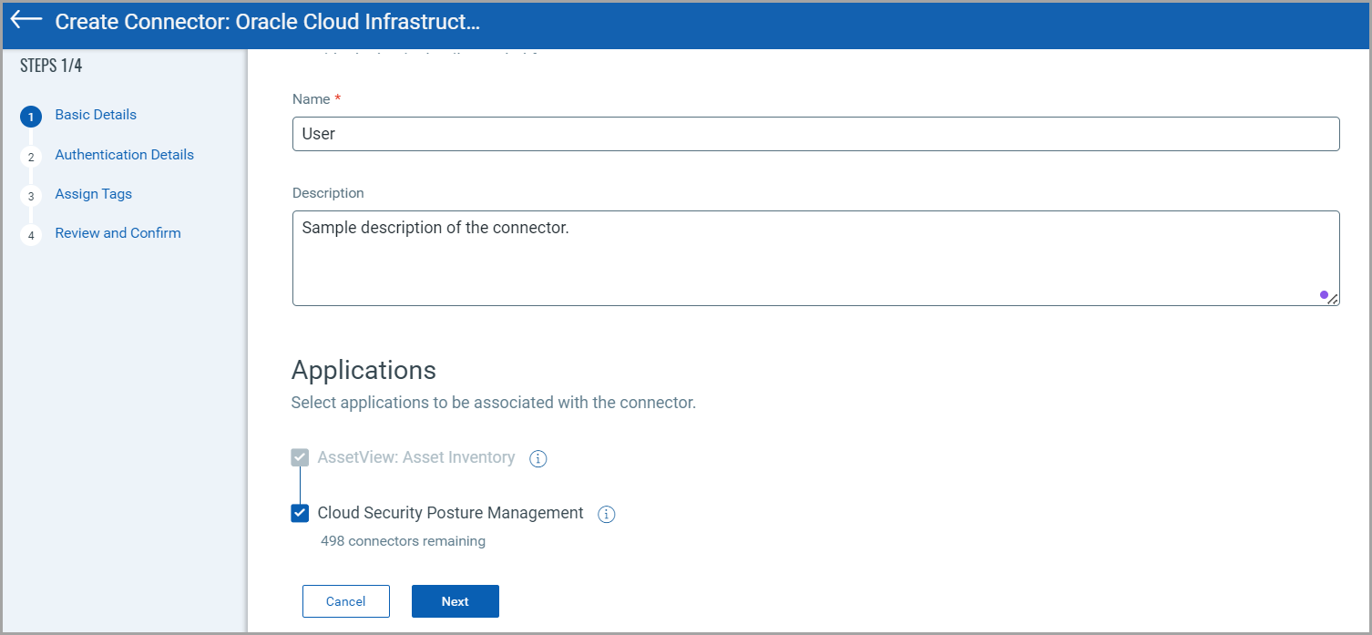 Assign tags to the connector that you are creating. You can also create a new tag. For details on creating new tags, see Configure Tags.