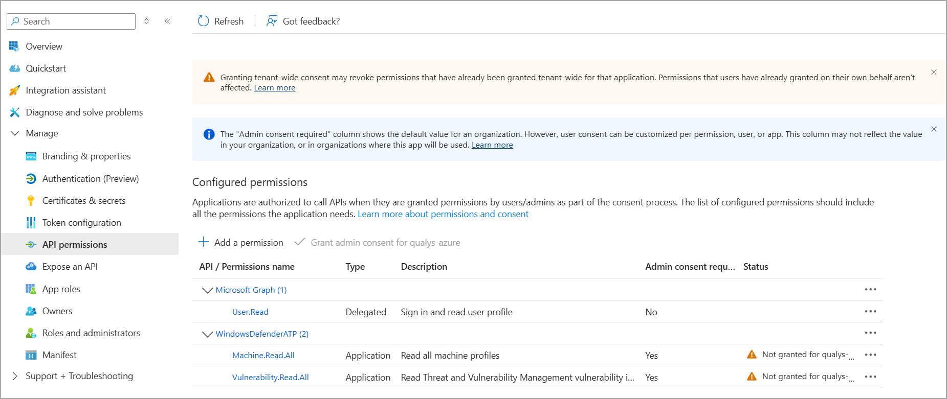 After adding the permissions, an administrator must grant admin consent. Navigate to API permissions and click Grant admin consent.