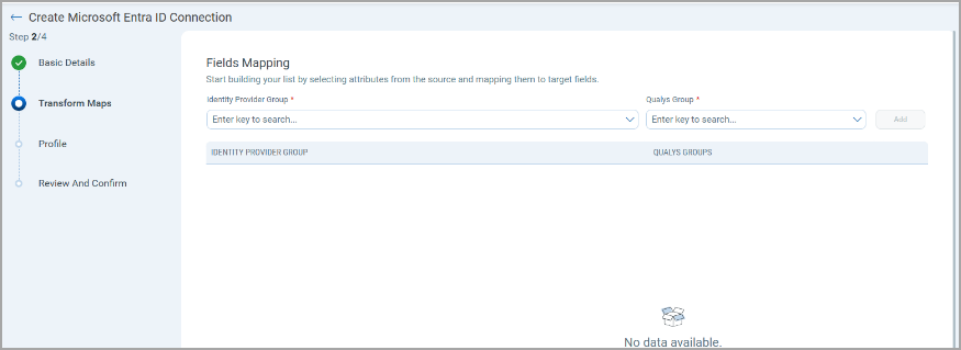 - Provide a Transform Map Name, select the Source Data Model (Identity Provider group), and select the Target Data Model (Qualys Group).