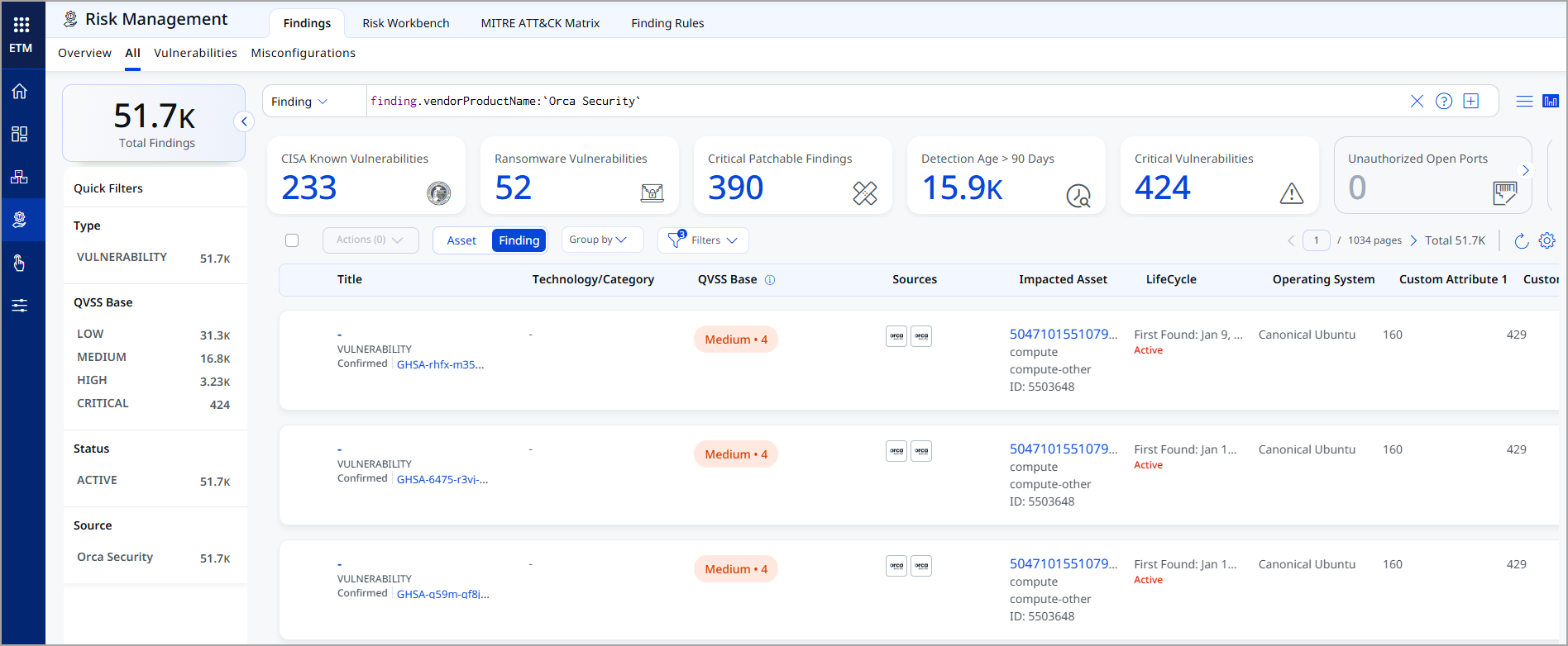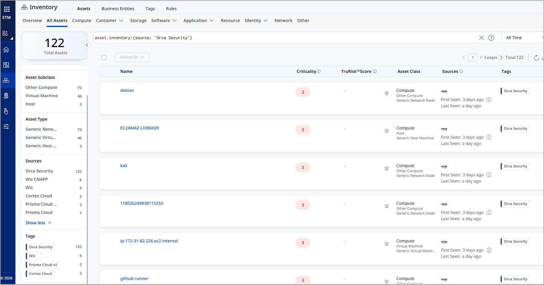 After ingestion, view Orca Cloud assets in ETM Unified Asset Inventory.