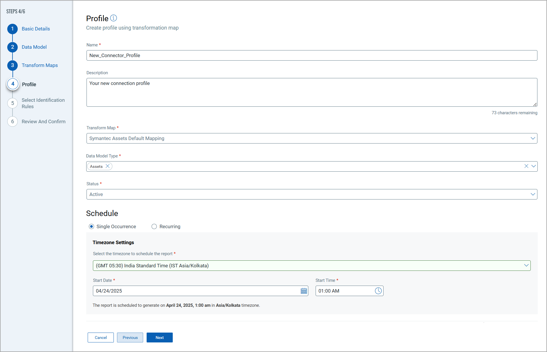 Create a profile for your connector. A profile decides the connector status, execution schedule and transform map to choose. The connector follows the configurations of this profile for all future executions.