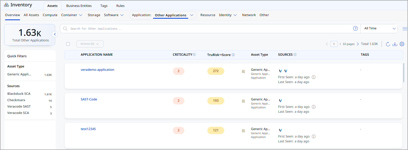 Navigate to Enterprise TruRisk Management > Inventory > Assets > Application > Other Applications to view imported Veracode code repositories.