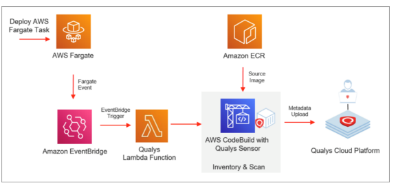 Since AWS Fargate is serverless, the solution launches a sensor whenever a new Fargate task is deployed. We will use AWS CloudFormation and a Qualys Lambda function to trigger scanning automatically. You’ll configure a CloudFormation template with your subscription details and a Qualys Lambda function with the Qualys S3 bucket name & S3 bucket key to trigger image scanning of images pulled from Amazon Elastic Container Registry (ECR).