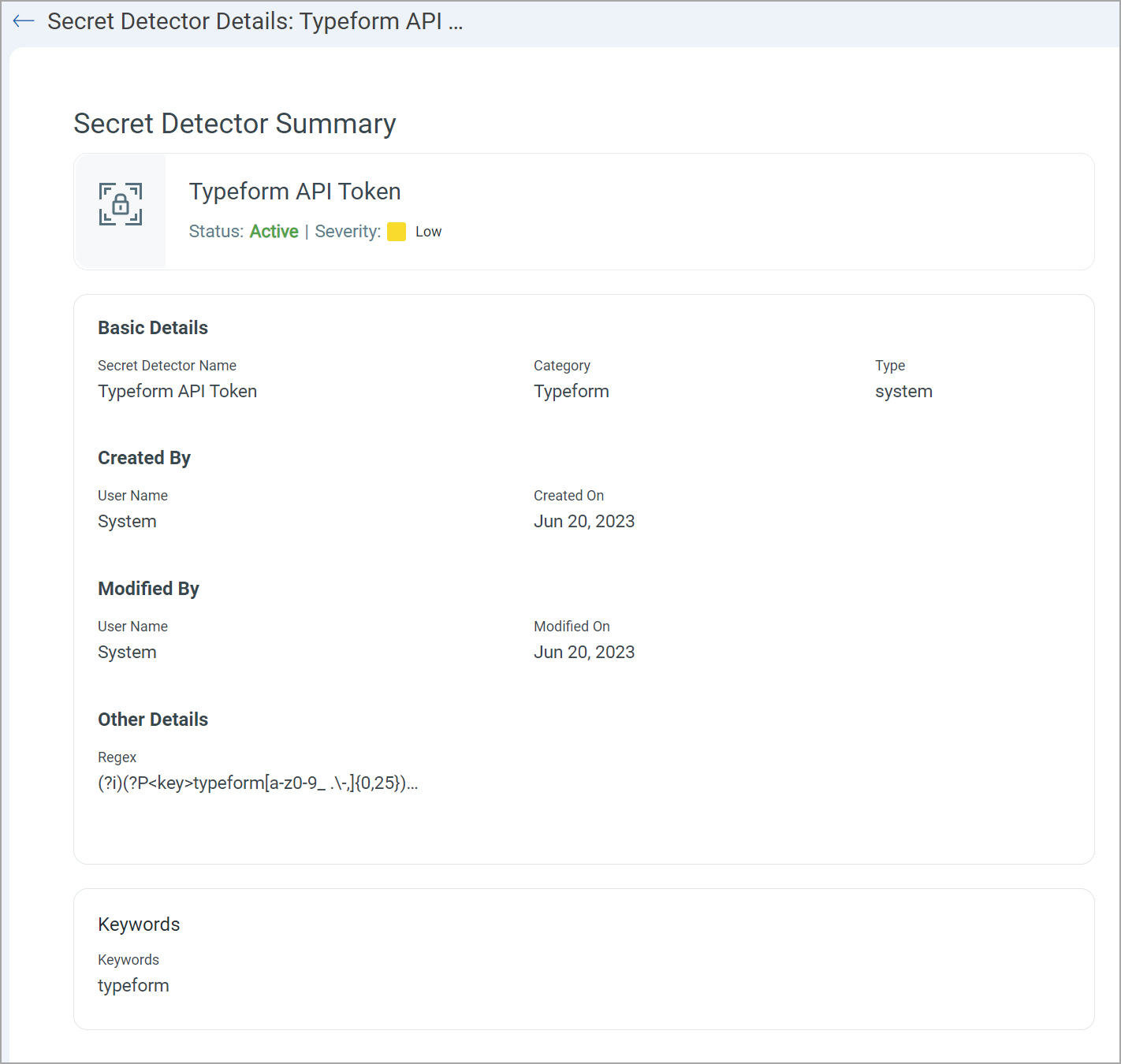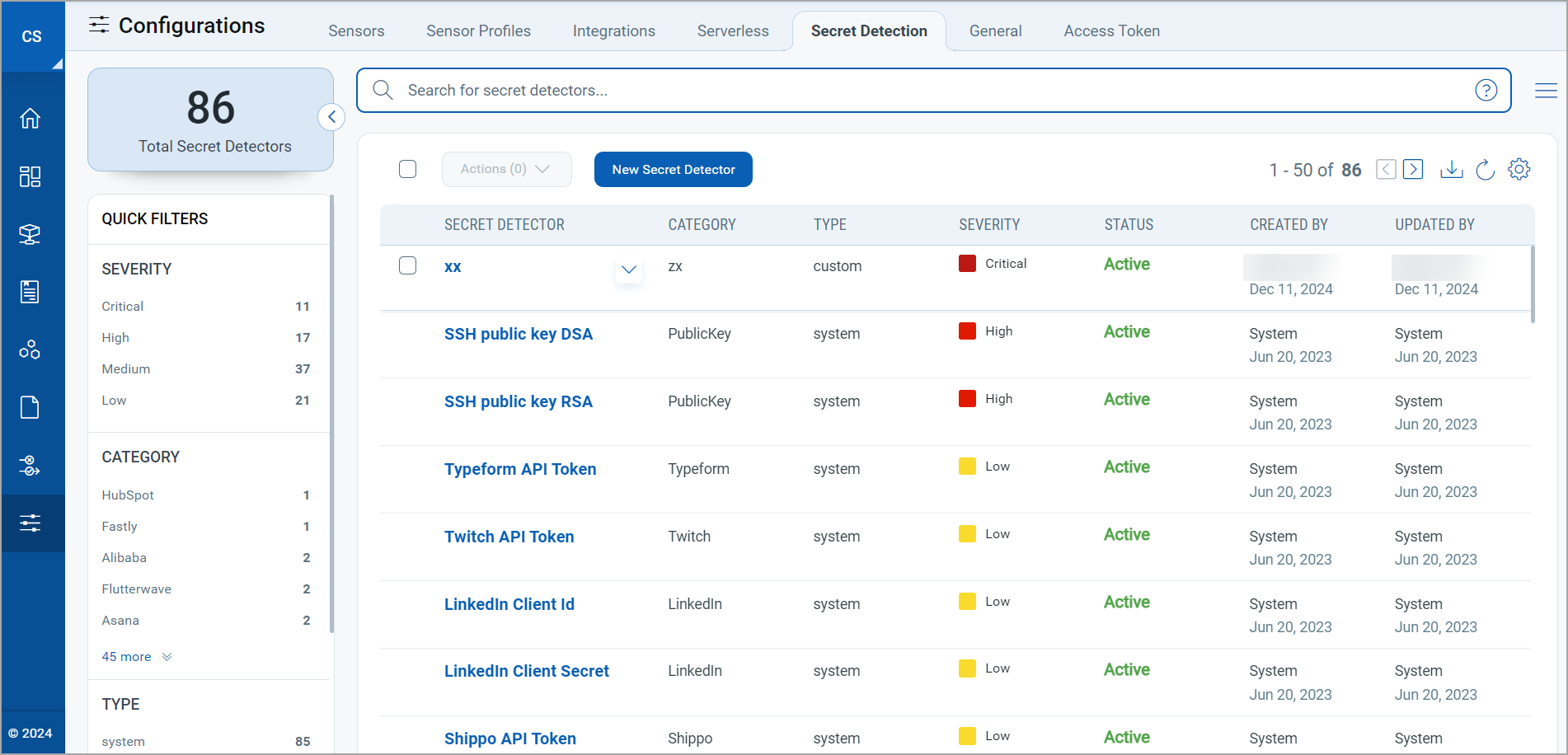 - Custom - Any Secret Detector which you create is considered as a Custom Secret Detector. You can set, re-set all fields of this secret detector. To know more, refer to Working with Custom Secret Detector.