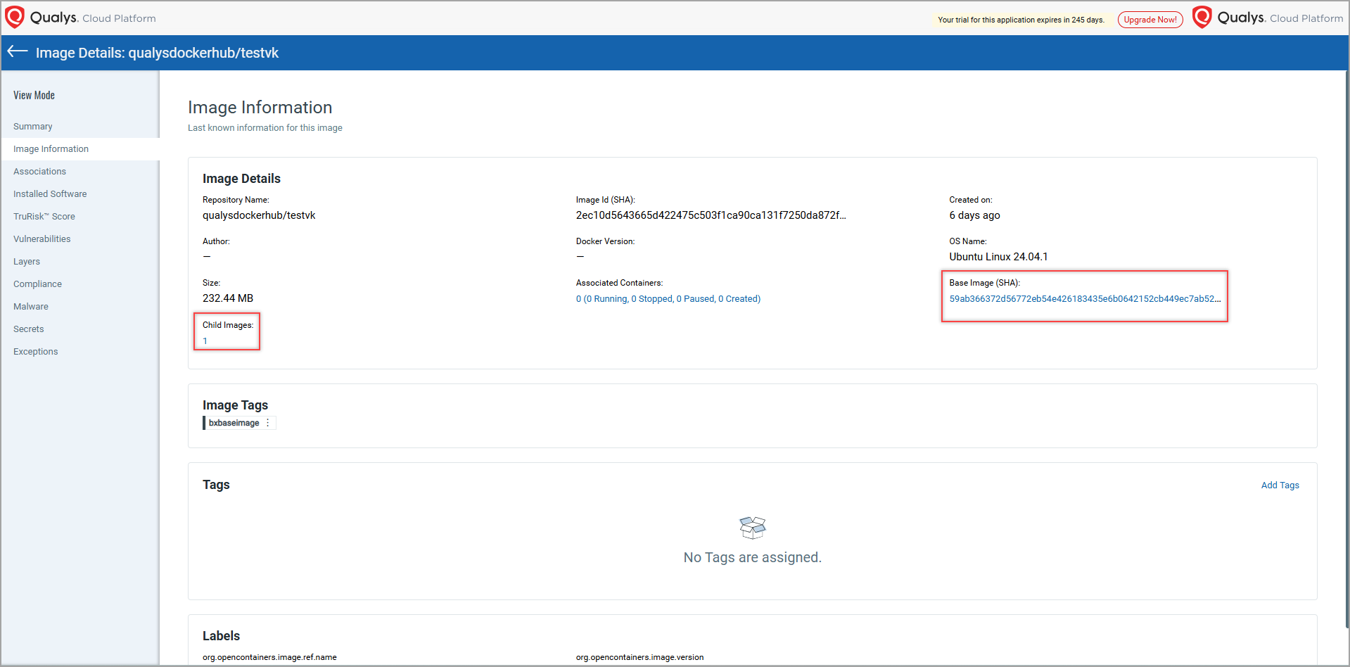 - The Image Information section provides more information about the image such as image size, creation date, image SHA, base and child images, user-scoping tags, and labels.