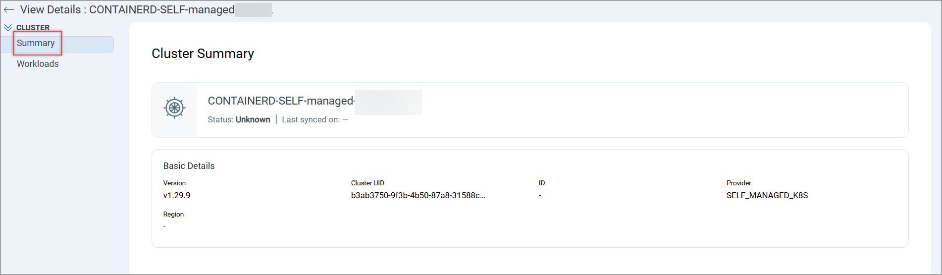 Select View Details from the Quick Actions menu to see Cluster Summary. This page gives you detailed information about the cluster, its IDs, cloud provider, and region in which the cluster is deployed.