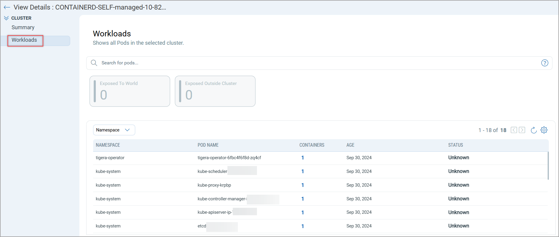 The Workloads page provides POD-level details such as namespace, name of the POD, number of containers in the POD, POD age (POD creation/updation time), and POD status. You can select a specific namespace to view selective PODs.