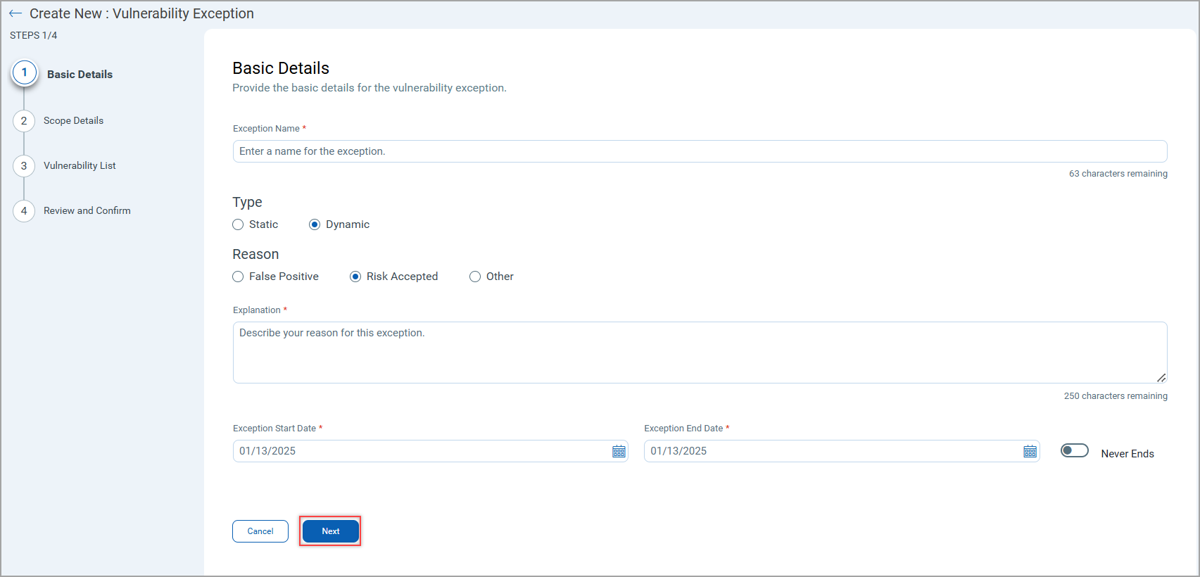 - Select a reason for the exception and then provide an appropriate explanation for the same. You can select either of the following options: