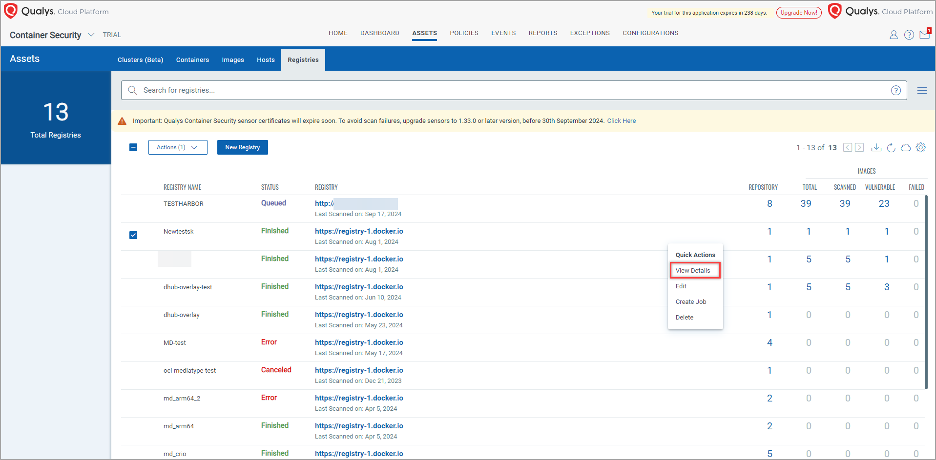 To get the total count of vulnerable images in a registry, go to the Assets > Registries tab. This Registry listing page provides details about the registry name, registry path, and count for scanned, vulnerable, failed images in that registry.