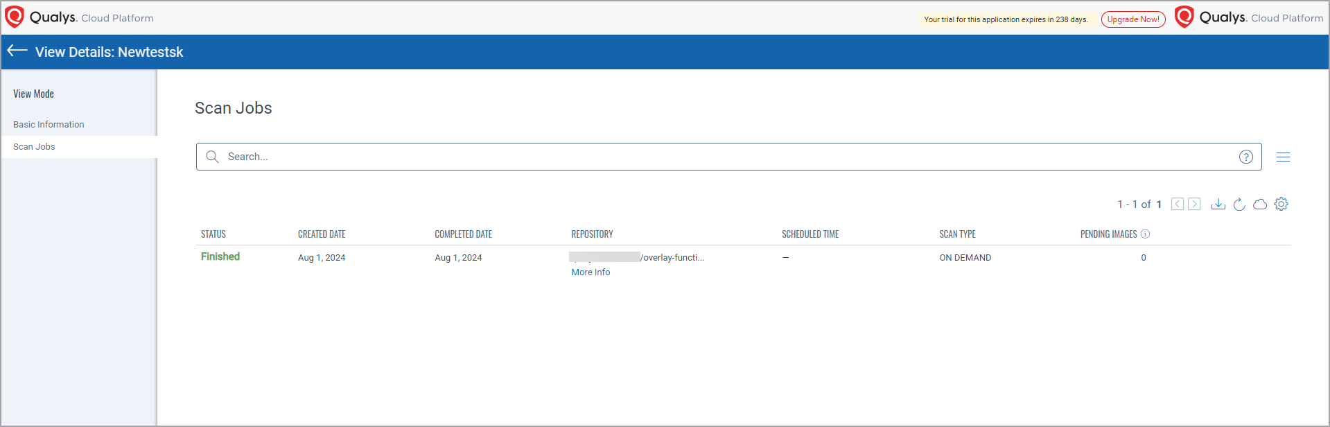 The View Details page provides more information about the Registry under Registry Summary and the scanned job under Scan Jobs.