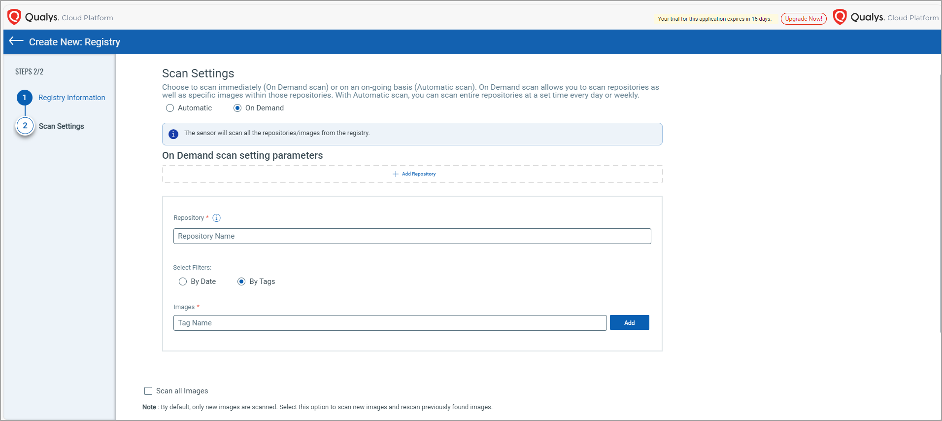 Like with other registry types, you can choose to scan immediately (On Demand) or on an on-going basis (Automatic). For help with scan settings, see Configure Scan Settings.