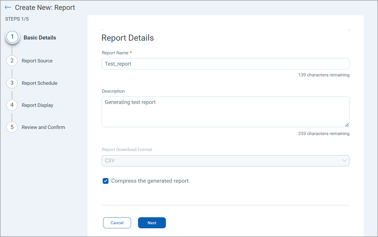 Under Report Details, enter a name and description for the new report. If you want to compress the generated report, select Compress the generated report checkbox and click Next.