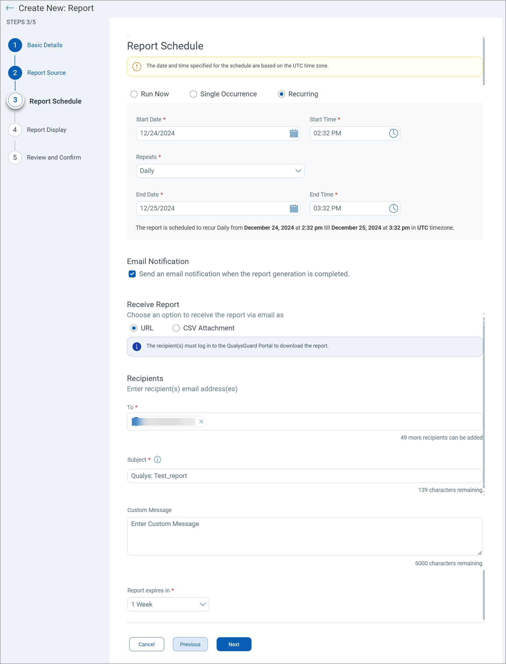 For a scheduled report, you need to define a schedule using Single Occurrence or Recurring to run the report at specified time or at regular intervals. You can create a daily, weekly, or monthly recurring schedule.