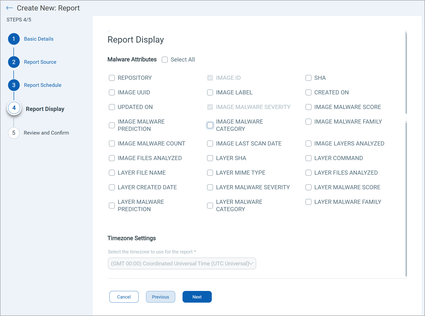 The image above shows you Report Display page of an Image Malware report. - For an on-demand report, specify the time zone where you want to view the date and time in your report.
