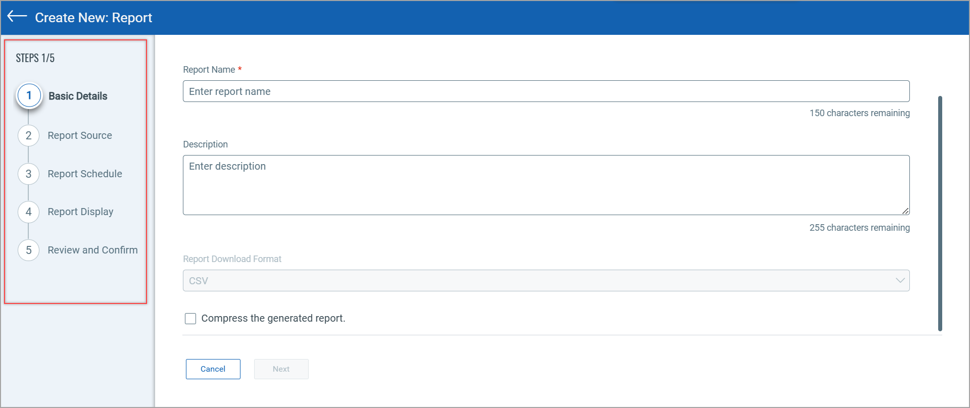 - Basic Details page - 'Compress the generated report' option.