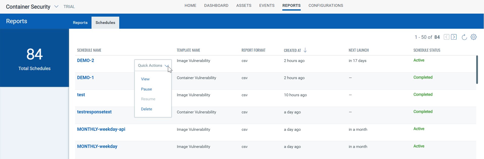 You can edit a report schedule using REPORTS > Schedules > Quick Actions menu. Using this menu, you can pause an Active schedule or resume a Paused schedule.