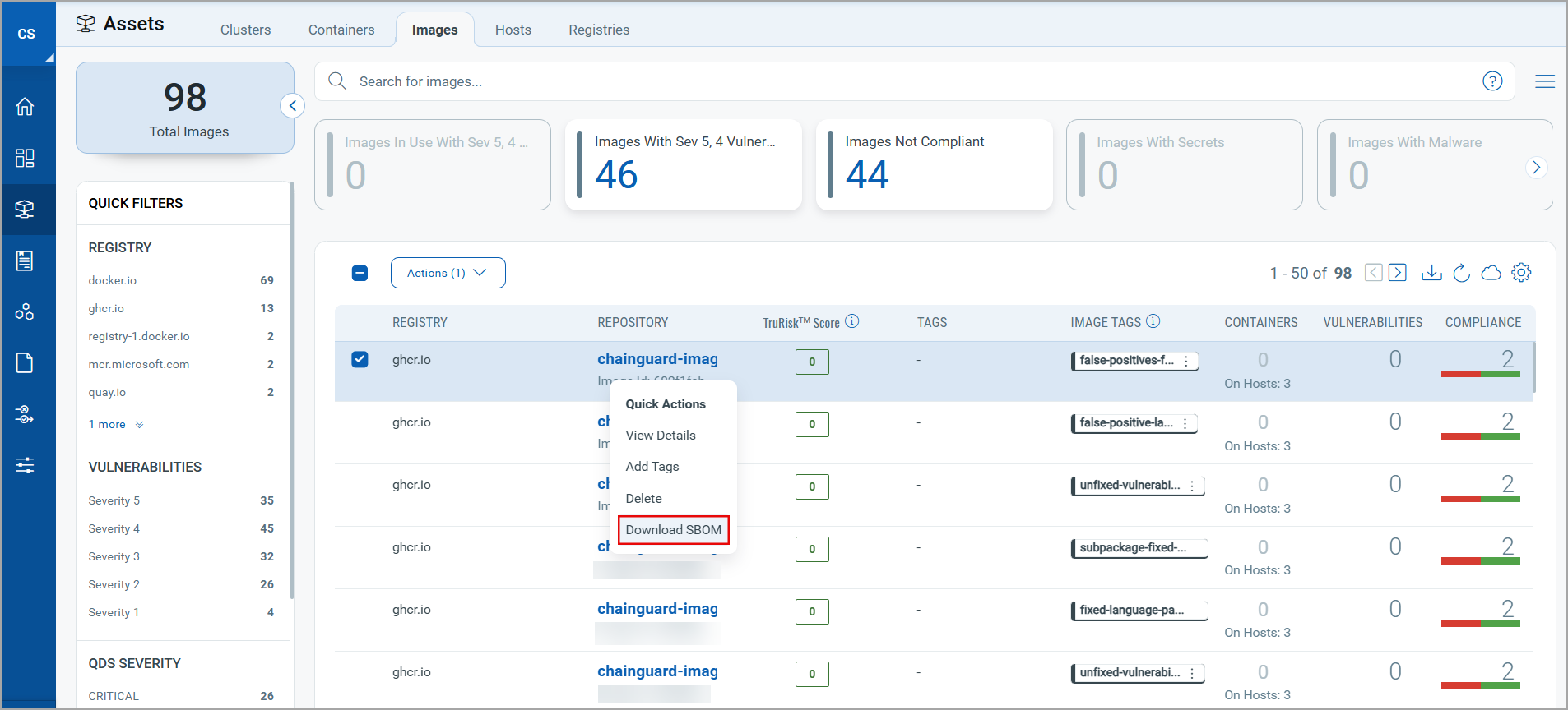 You can download Software Bill Of Material (SBOM) report of a scan using ASSETS > Images > Quick Actions > Download SBOM.
