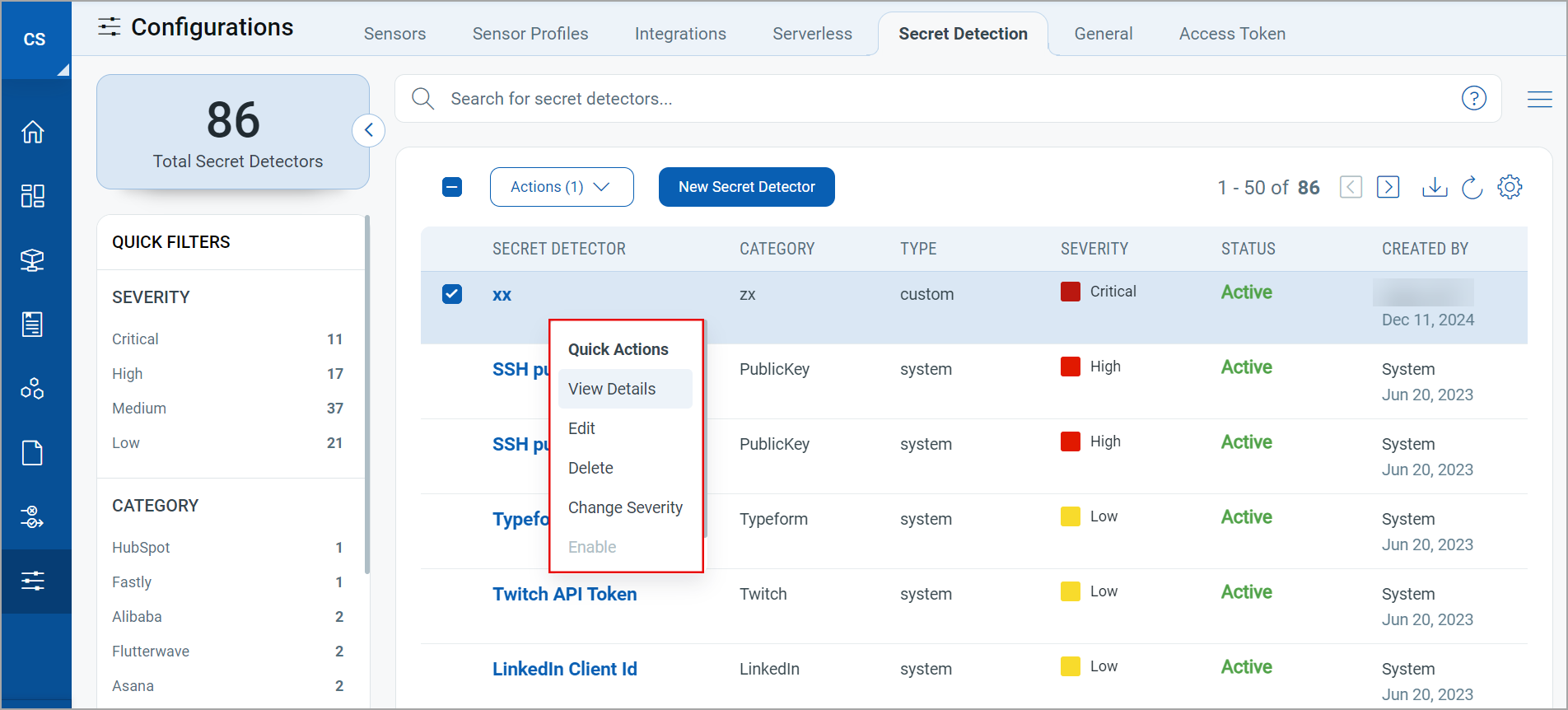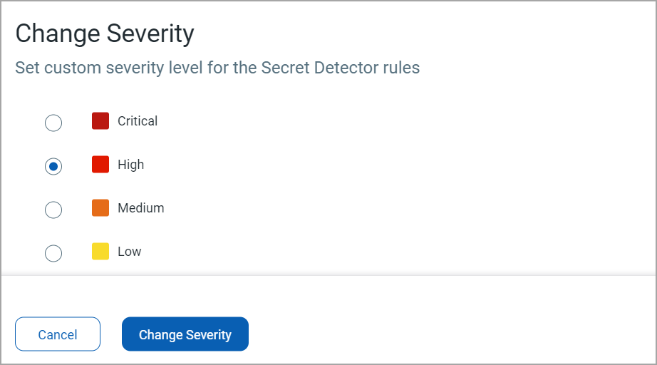 You can change the Severity and Status of Secret Detectors. Any one of the following Severity options can be assigned to a Secret Detector - Critical, High, Medium, and Low.