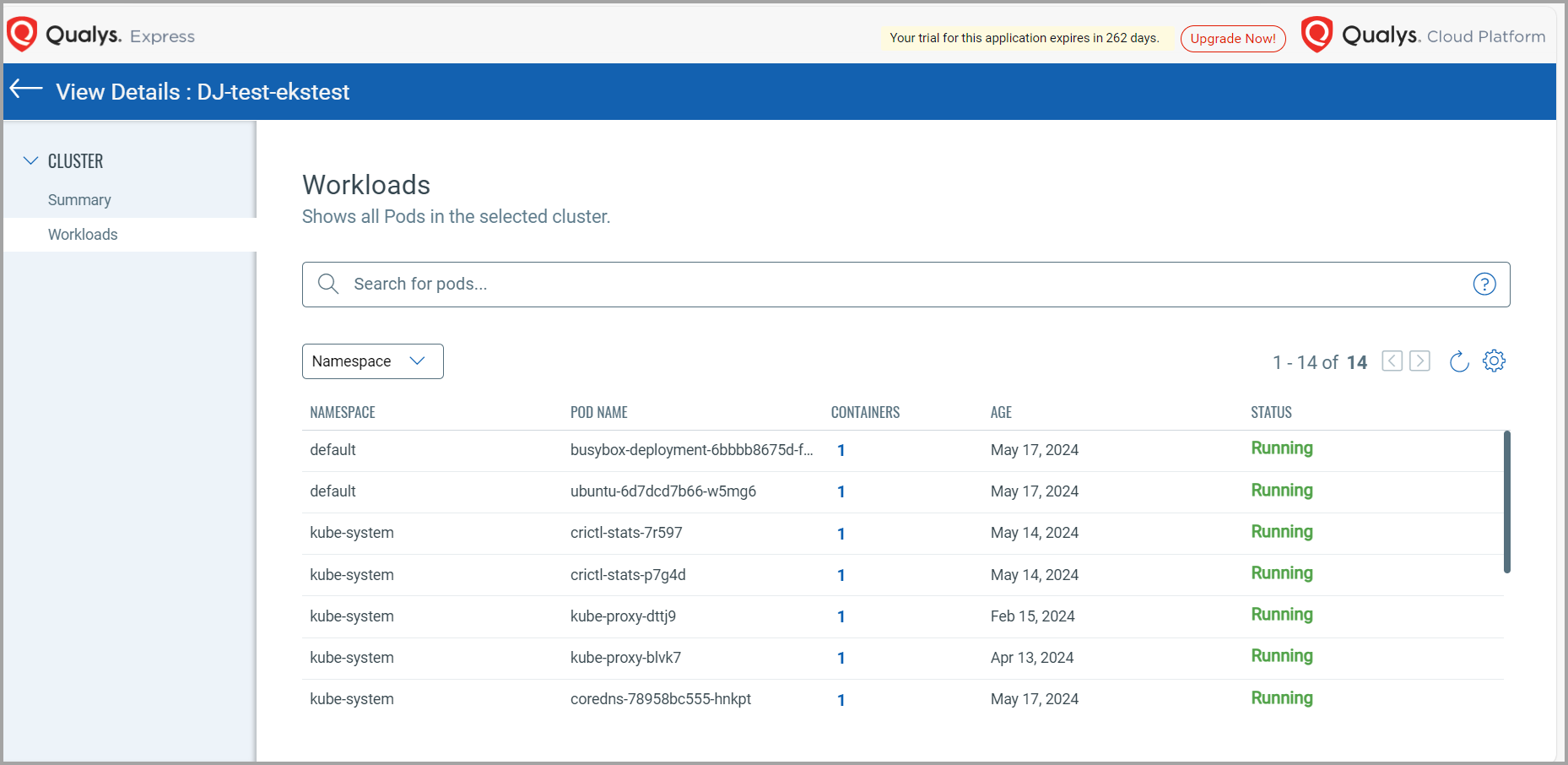 The Workloads page shows details of the PODs in the selected cluster such as, name of the POD, used namespace, and containers.