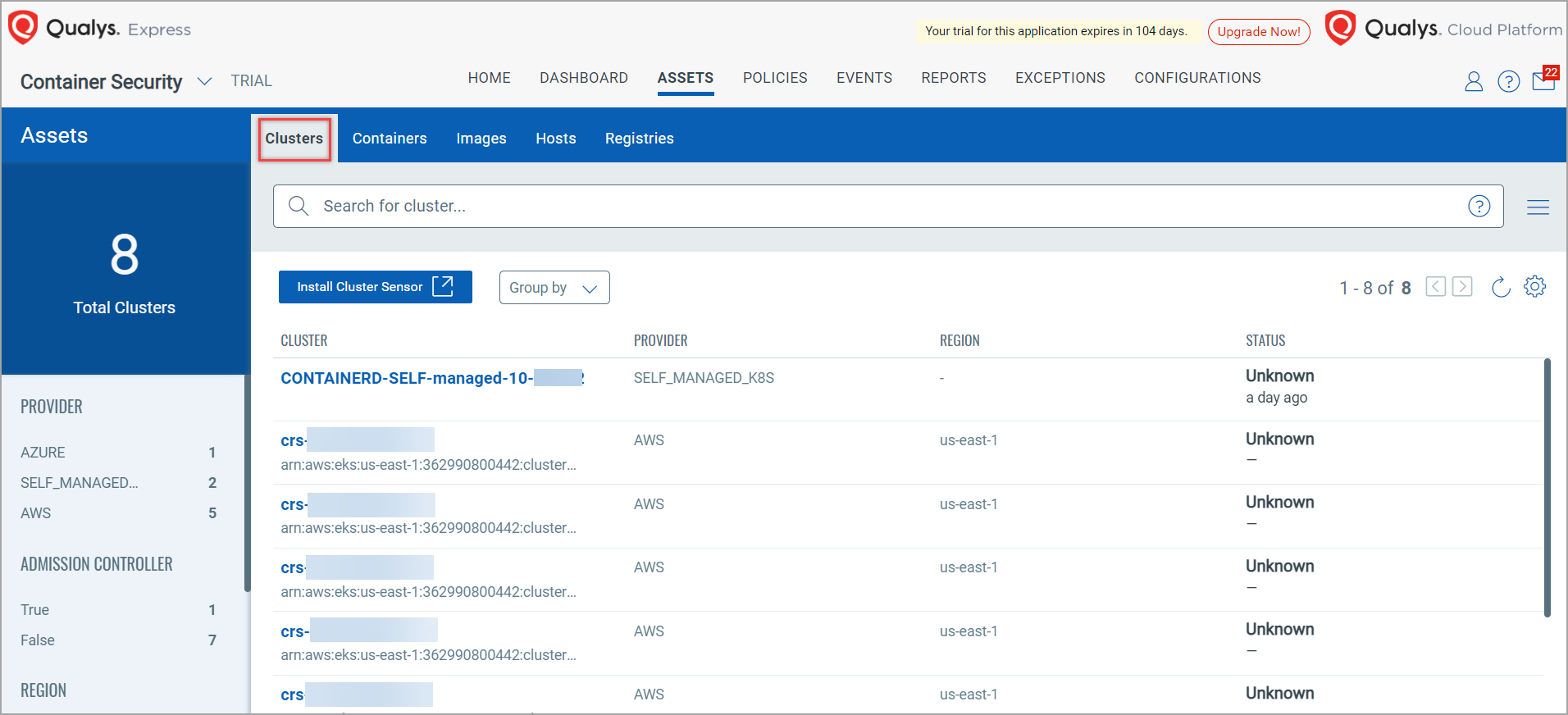 Cluster Sensor displays the K8s inventory data of your clusters on your Qualys Cloud Platform. This inventory data is displayed under the ASSETS > Clusters tab.