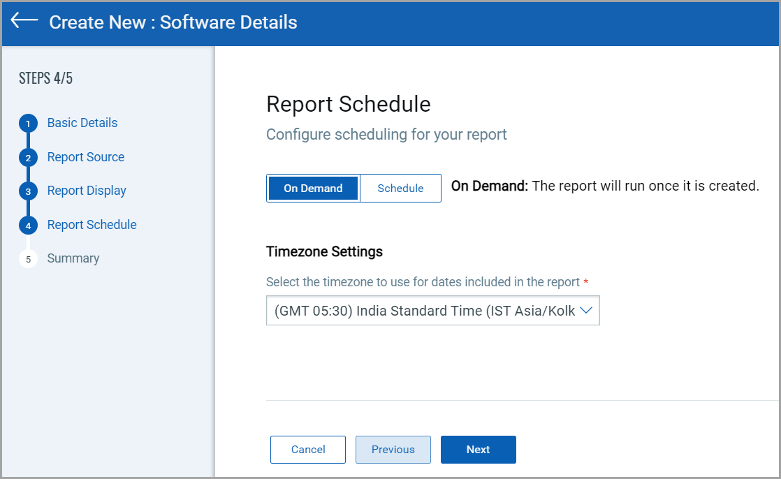 On Demand: If this option is selected in the report, report will be generated once it is created. Select the timezone for dates in the report to be generated.