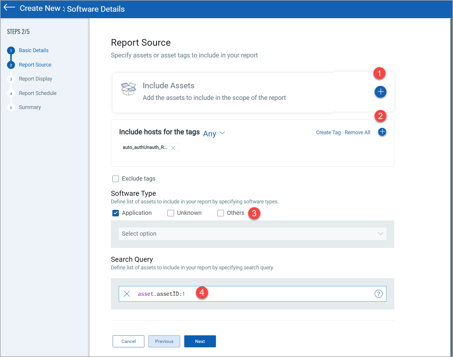In the Report Source step, you can define the scope of the assets to be included in the report. You can select assets with asset name(1), asset tag(2), Software Type(3) or using search query(4).