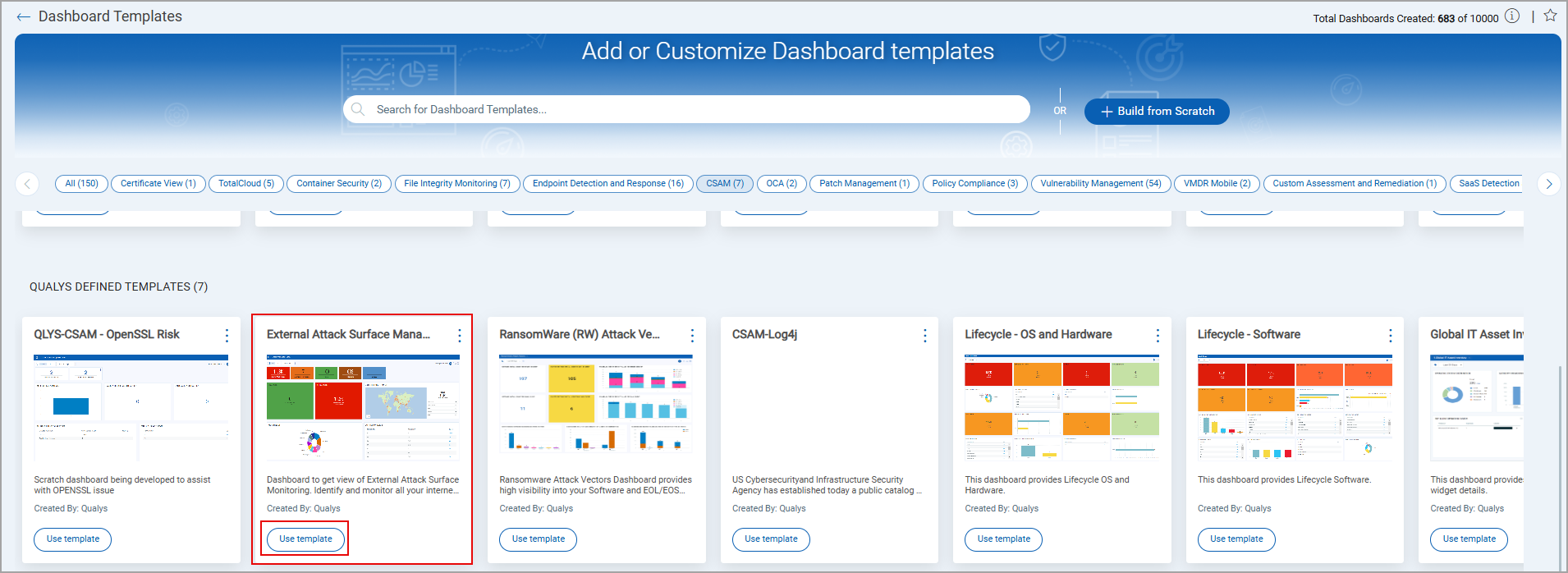 2) Choose CSAM as the dashboard template, and click Use template from the highlighted template.
