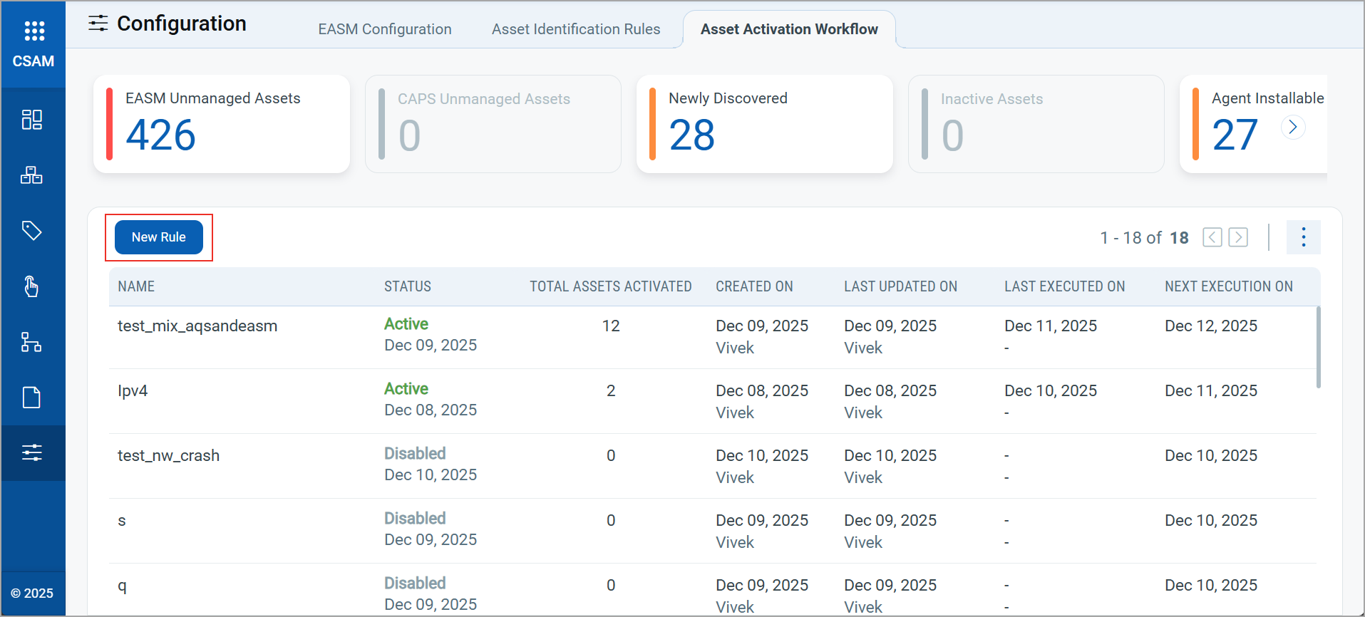 Activate assets in bulk by creating a QQL-based or a tag-based rule. The assets are activated after the rule is executed.