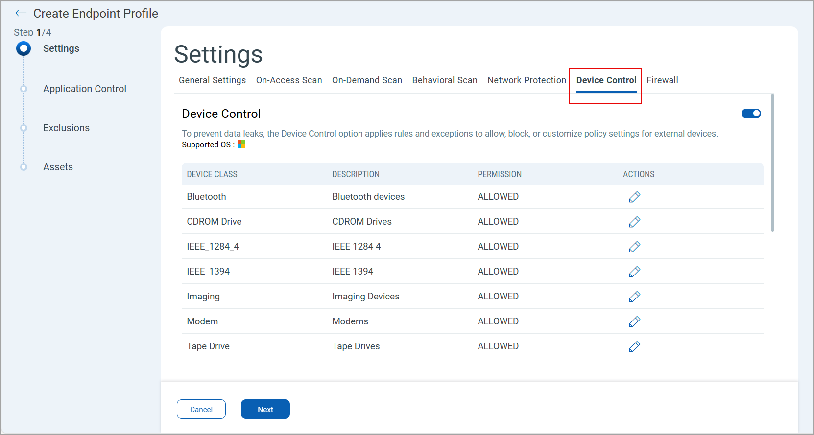 The Device Control section helps prevent data leaks by applying rules and exceptions that allow, block, or customize policy settings for external devices such as USB drives, Bluetooth peripherals, and storage media.