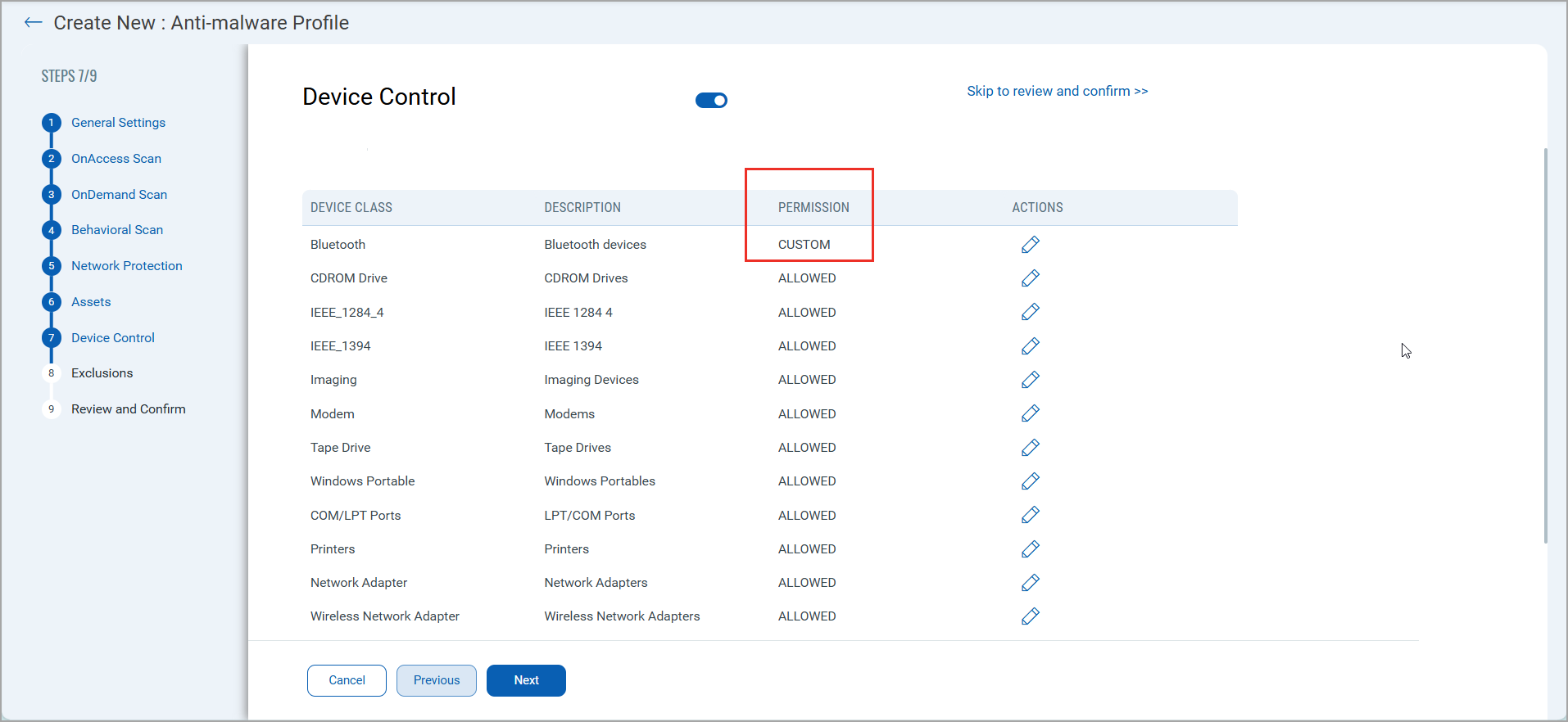 Once the device class permissions are configured in the Device Control, you can exclude the devices in the Exclusions step. For more information about device control exclusion, refer Exclusion Support.