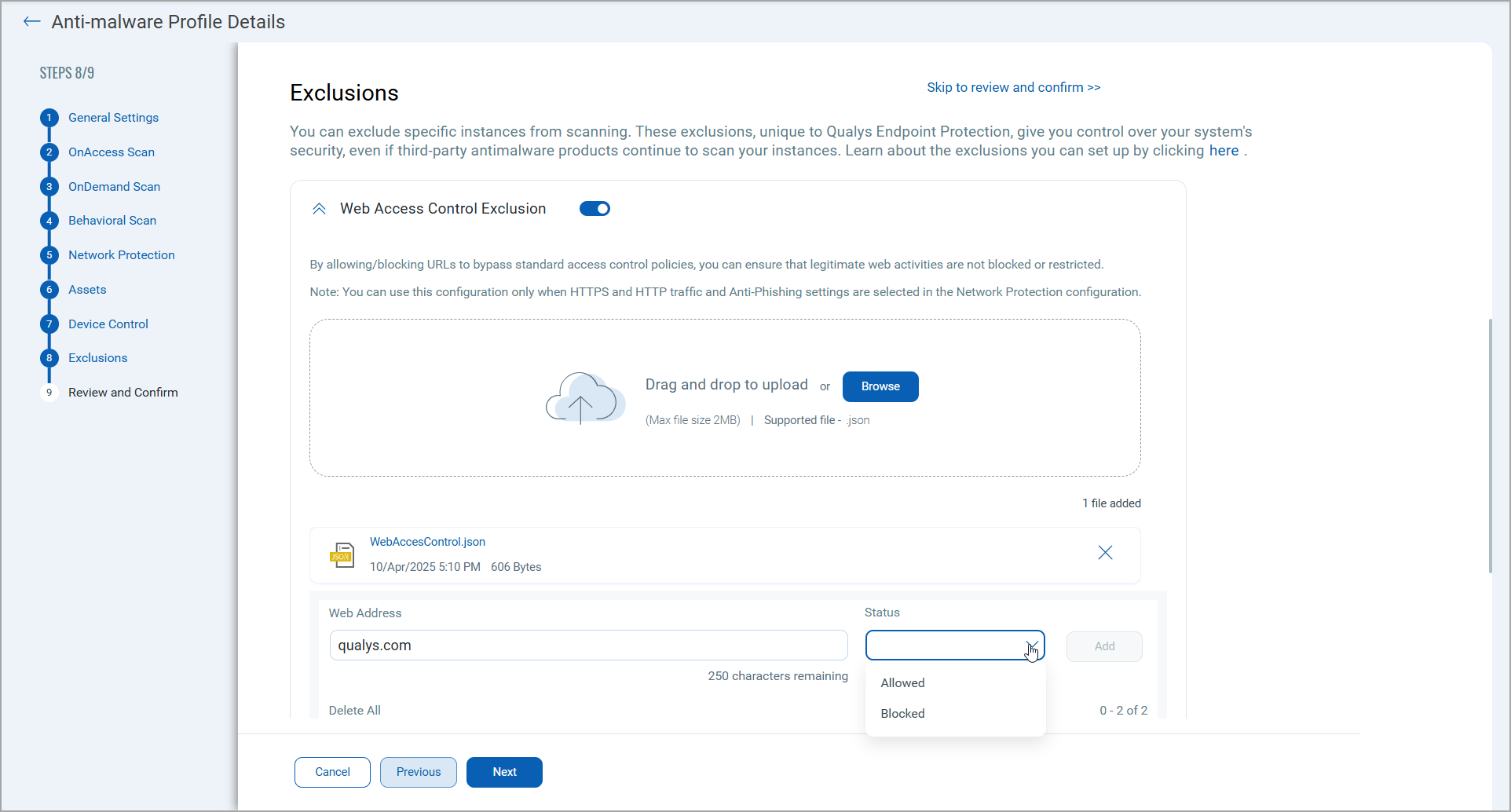 Toggle the Web Access Control Exclusion to allow or block any websites. Perform the following steps to create Web Access Control Exclusion. Alternatively, you can upload a .JSON file up to 2 MB.