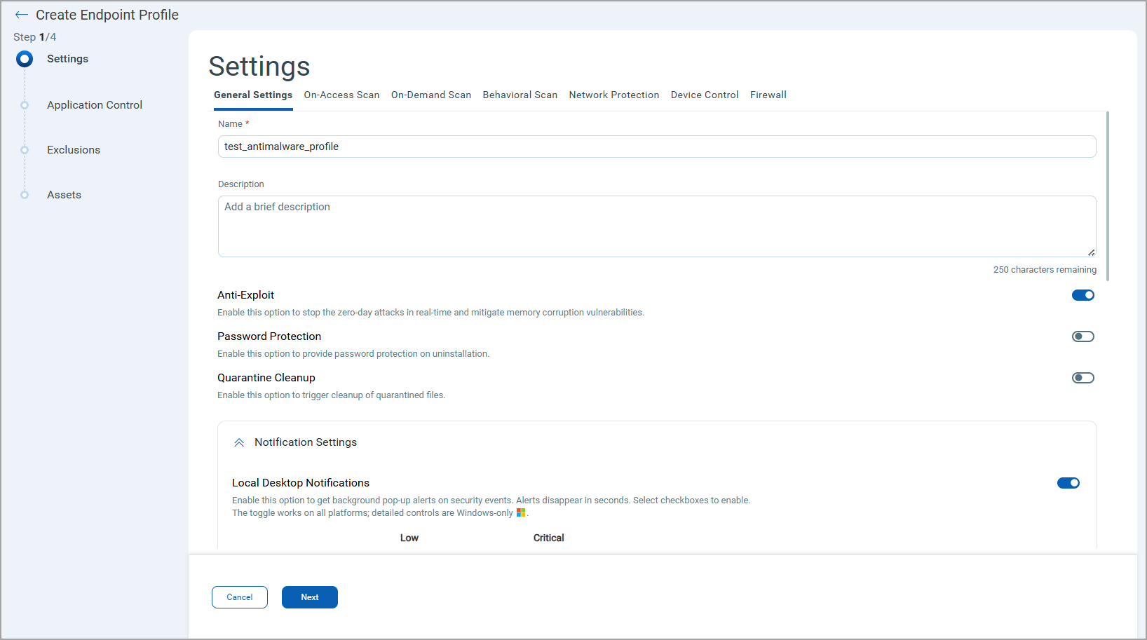 The General Settings section defines the basic configuration for your Endpoint Security Profile.