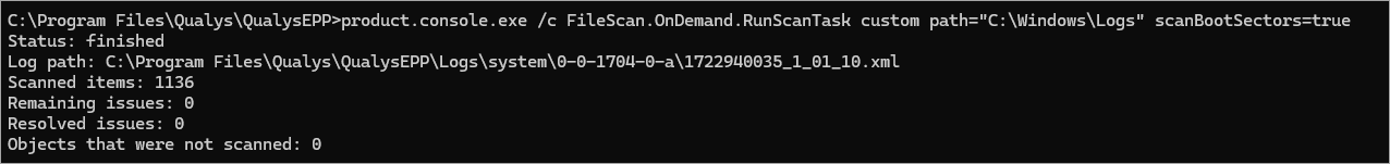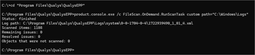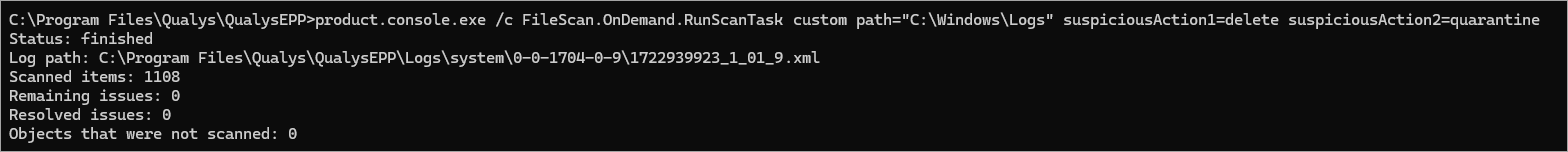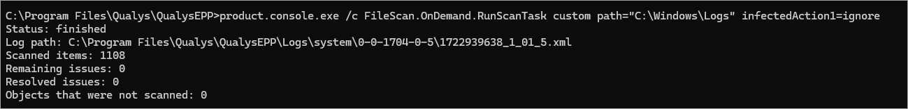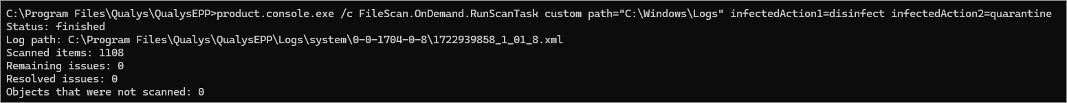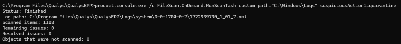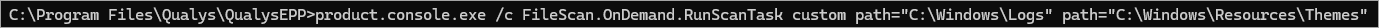 .\product.console.exe /c FileScan.OnDemand.RunScanTask custom path= “define the directory that needs to be scanned”
