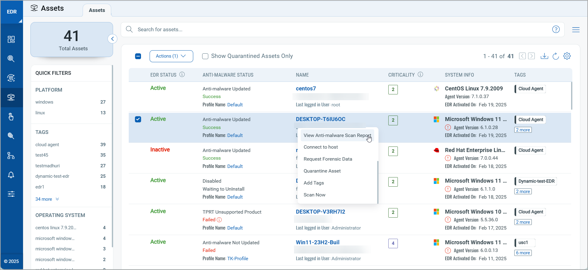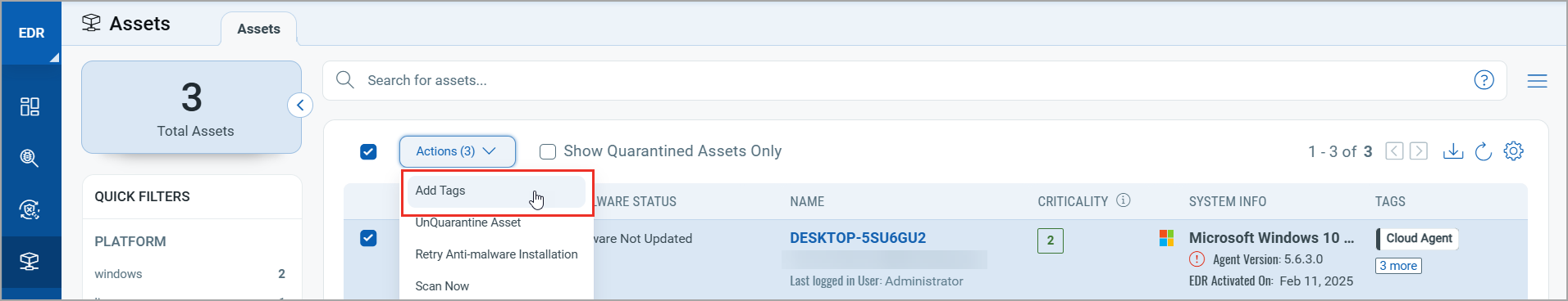 - In the Assets tab, select the Asset that you want to quarantine. The Agent version should be 4.9.0 and above.